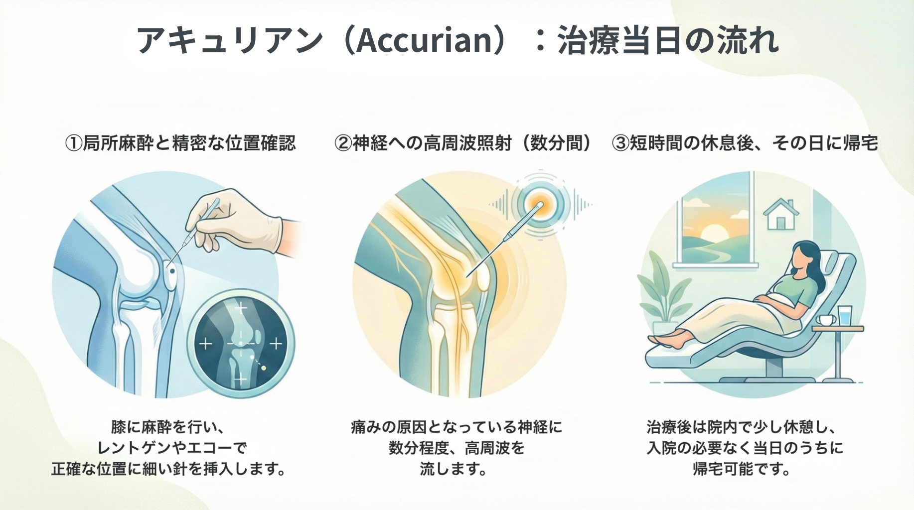 ラジオ波焼灼治療“アキュリアン”は、膝の慢性的な痛みに対して、手術をせずに行える新しい治療法です。